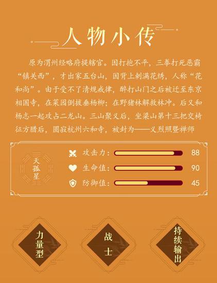 在游戏中鲁智深的设计也更体现了他的英雄本色,鲁智深属近战英雄,更适合做前排输出位英雄,如何能让鲁智深存活的更久,是阵容搭配的重点~