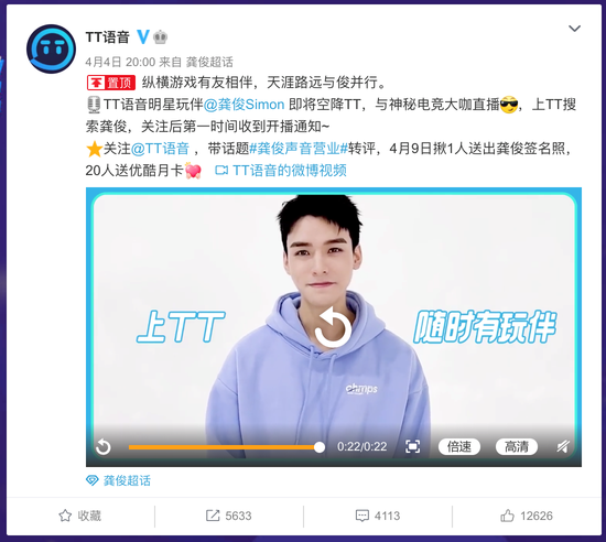 4月4日,国内领先的游戏社交平台TT语音官宣了明星玩伴龚俊,并向广大粉丝用户宣布:4月8日,龚俊将在TT语音开启直播首秀,与一众电竞大咖连麦开黑。