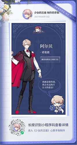为了回馈公主殿下的热情及支持,《少女的王座》也为公主殿下准备了诸多趣味活动和惊喜大礼。目前,“少女的王座 心意手账”微信小程序已正式上线,公主殿下可记录下与他有关的点点滴滴,或许还能收到特别回应哦。公主殿下用手机微信识别小程序码,即可进入心意手账小程序。公主殿下可自选手账本样式,自由编排手账背景、各角色贴纸、多色文本等各项内容,DIY独属于你与他的心动纪念册!贴纸和DIY玩法也会在后续更新,敬请期待噢。