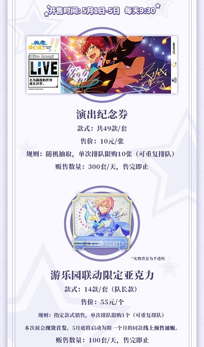 在北京站将有丰富的周边和各位制作人们见面。帅气的演出纪念券、游乐园联动限定亚克力(队长款)充分展现了小偶像们的舞台魅力,想要留下五周年纪念的制作人们千万不要错过本次周边贩售!