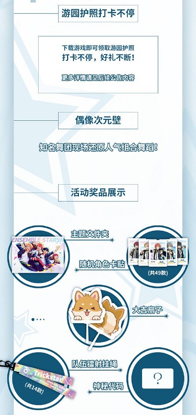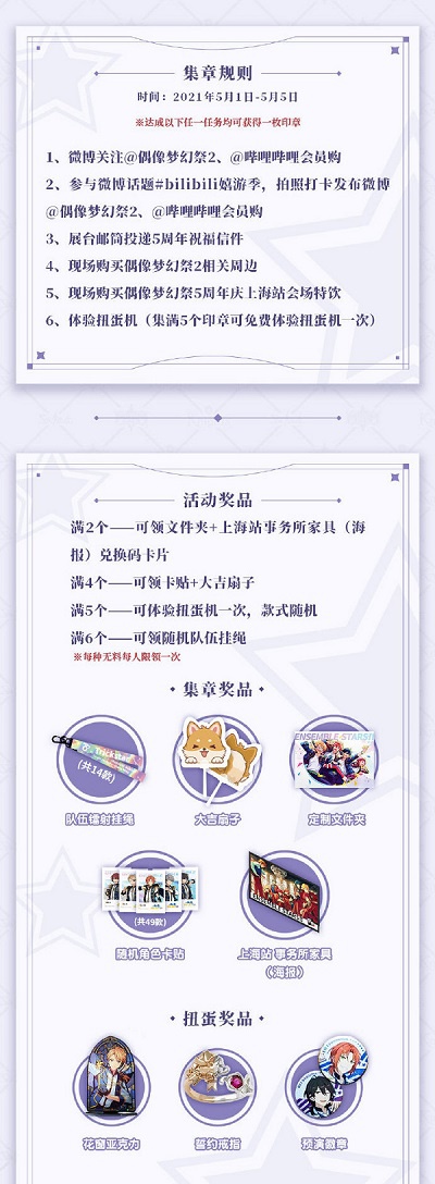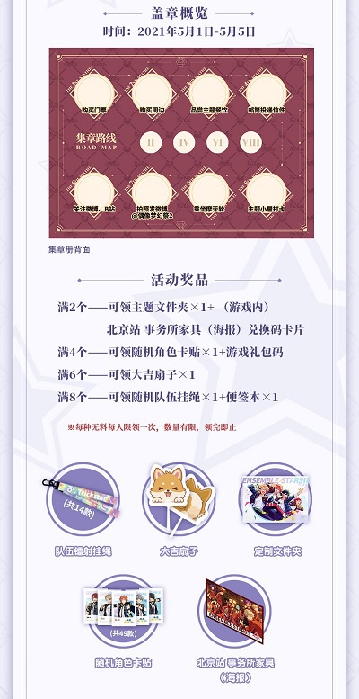制作人们集满不同数量的章,可以兑换队伍镭射挂绳、大吉扇子、定制文件夹、随机角色卡贴、北京站 事务所家具(海报)兑换码卡片等。数量有限,制作人们立刻行动起来吧!