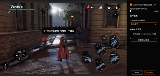 此外针对《鬼泣-巅峰之战》这游戏的连招系统,手游助手还配置了两种操作模式。除了上文说的纯键盘操作的街机模式外,还有一套键鼠操作的战斗模式。这模式的最大好处是更符合玩家的操作习惯,一个鼠标即可完成出招和转视角等操作,在打大型boss时尤其好用。