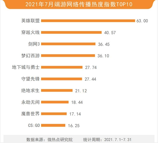 除手游外,端游同样受到众多玩家关注。7月18日,电竞纪录片《热爱我们的热爱》首度曝光片花令英雄联盟相关信息增加,明星主理人@小鬼-王琳凯 携手电竞主理人英雄联盟教练@JX阿布等讲述自身经历,明星效应令英雄联盟以63.00的热度指数稳居端游榜榜首。本月穿越火线以40.57的热度指数位列第二。剑网3、梦幻西游、地下城与勇士、守望先锋、绝地求生、永劫无间、魔兽世界、CS:GO等分列三至十位。