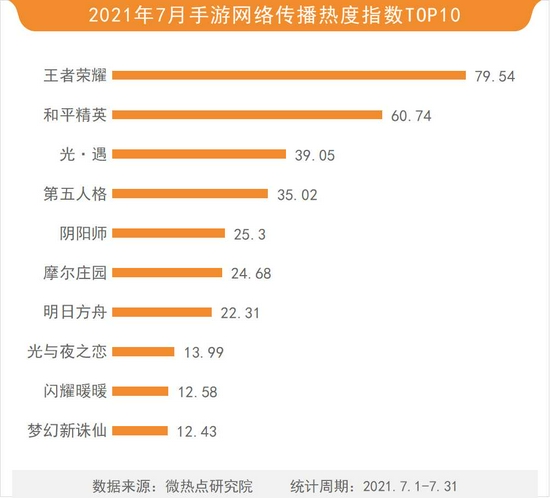 据微热点研究院统计显示,2021年7月,腾讯游戏旗下的MOBA类手游王者荣耀以79.54的热度指数蝉联手游榜第一。和平精英与光·遇分列榜单第二、三位,热度指数分别为60.74和39.05。第五人格、阴阳师、摩尔庄园、明日方舟、光与夜之恋、闪耀暖暖、梦幻新诛仙等排名四至十位。