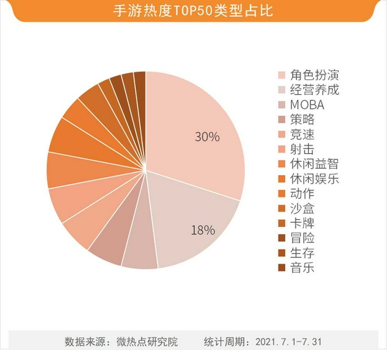 在最受网友关注的手游TOP50中,按照游戏类型划分,角色扮演类占比达30%,经营养成类占比为18%。在热门手游中,角色扮演与经营养成依然是最受玩家关注的两类手游。