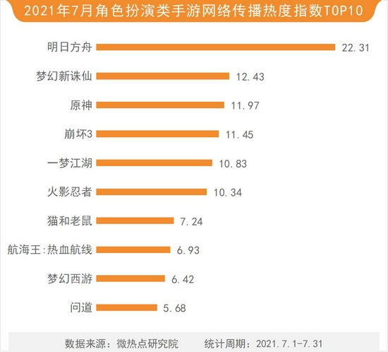 在本月角色扮演类手游中,明日方舟以22.31的热度指数继续占据榜首。梦幻新诛仙、原神、崩坏3、一梦江湖等紧随其后。
