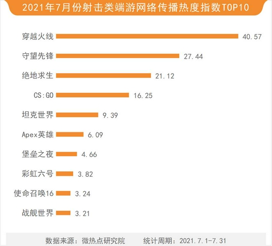 在射击类游戏中,穿越火线以40.57的热度指数依然位居榜首。守望先锋、绝地求生、CS:GO、坦克世界等位列其后。