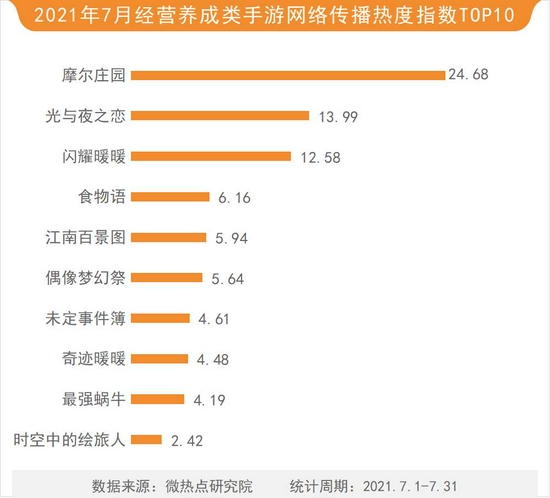 本月经营养成类手游中,摩尔庄园以24.68的热度指数蝉联该类手游TOP10榜首。光与夜之恋以13.99的热度指数位列第二,闪耀暖暖、食物语、江南百景图等排名三至五位。