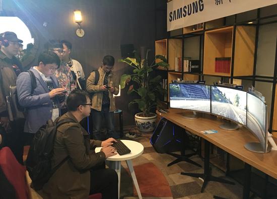 而在同步进行的曲面显示器专场上,三星更是玩出了新花样。无论显示效果的对比,还是4组曲面显示器三联屏的游戏体验,都是极大的引发了到场媒体和现场观众的踊跃参与。