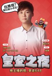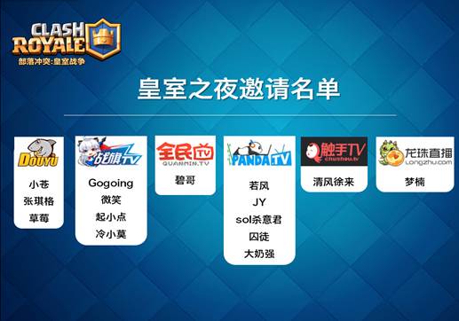“皇室之夜”将于7月14日晚,在斗鱼、战旗、熊猫、触手、龙珠、全民TV等六大直播平台同步开启,声势空前浩大。