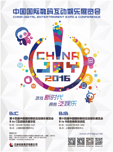 2016年第十四届ChinaJoy将于7月28日—7月31日在上海新国际博览中心举行。中国国际数码互动娱乐展览会(简称:ChinaJoy)是 ChinaJoy品牌最重要的组成部分,其中的BTOB综合商务洽谈区集企业品牌、产品、技术、资本于一体,打造产业综合商务服务功能,在展示、洽谈及投 融资推介等一系列商务途径中,继续推进国内、中外游戏企业之间的广泛商务沟通和合作,彰显ChinaJoy所具有的产业引领、带动和发展的功能与作用。