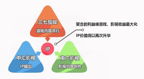 中汇影视有丰富的IP积累和行业领先的IP挖掘能力,推动泛娱乐体系前端的IP获取进程;中汇与南广在影视开发领域进行合作,实现IP再预热与首次价值引爆;同时,三七互娱以游戏产品进行同步推广,二次引爆IP的商业价值。