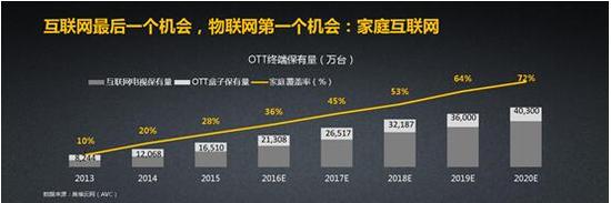 而在中国,主机游戏错过了黄金发展期,但智能电视的爆发式增长逐步成为客厅娱乐下一站的重要平台。作为一个新兴的产业,中国的智能电视业近年来不断飞速发展,据奥维云网联合中国电子信息行业联合会发布的《2016年大屏生态运营大数据蓝皮书》显示,作为家庭互联网设备的核心,2015年OTT终端(包括智能电视及盒子)保有量达到1.65亿台。预计到2020年,OTT终端保有量将突破4亿台,超七成的中国家庭使用OTT端收看节目。