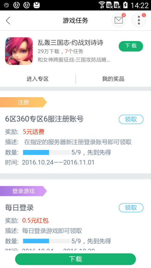 为此,360移动开放平台在近期为游戏开发者开放了全新的游戏任务系统。CP可以自助提交并发布相关任务,游戏玩家可以在360手机助手、游戏大厅下载游戏时领取任务,通过完成相关任务来领取相关奖励,从而增加该游戏的下载、登陆、充值等。