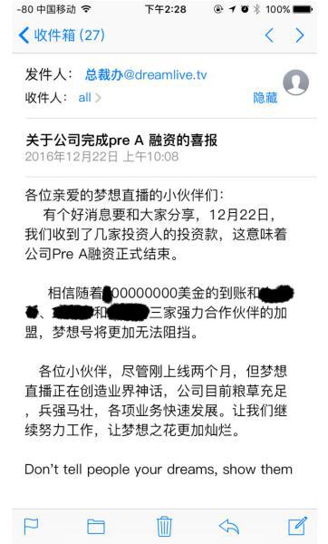 一位不愿具名的资深媒体人获得公司内部邮件,邮件显示,最迟在2016年12月22日,公司收到数亿美金投资款,投资方总共三家。公司以总裁办的名义表示,“公司目前粮草充足,兵强马壮”,但公司并未透露估值情况。