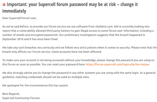 Supercell在公告中表示,“如此前所说,我们的论坛服务软件来自vbulletin.com,我们现在正在调查一个报道,说的是一个漏洞的存在使得第三方黑客非法获得了论坛用户信息,包括他们的邮件地址和登录密码,我们初步调查的结果是,这次事件发生在2016年9月,而且漏洞随后就已经被解决了。我们对待所有这样的事件都非常认真,在用户安全方面一直都有非常严格的要求,需要向大家澄清的是,这次黑客袭击只影响了我们的论坛服务,游戏账号未受影响”。