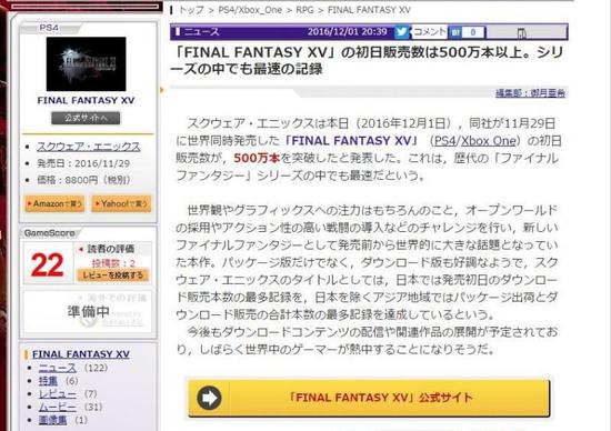 SE于2016年12月1日公布,全世界发行的《最终幻想15》首日贩卖数字为500万份。《最终幻想15》凭借宏大的世界观、精致的游戏画面、开放世界的设定和动作性高超的战斗导入制作,达成了在日本发卖首日数字版销量冠军和日本以外亚洲地区的盒装数字版合集的销量冠军成绩。
