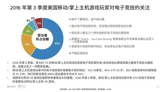 3.2016 年第 3 季度,在美国有大约 7% 的移动/掌上游戏玩家是电子竞技爱好者 (亲自参加比赛或观看大量电子竞技点播视频,或看过至少一项赛事直播)。