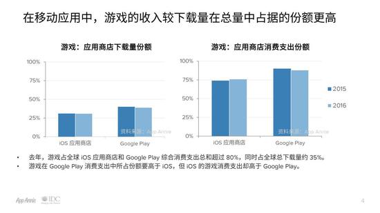 1。在移动应用中,游戏类的收入比下载量占据更高的份额:游戏占全球 iOS 应用商店和 Google Play 综合消费支出总和超过 80%,同时占全球总下载量约 35%。