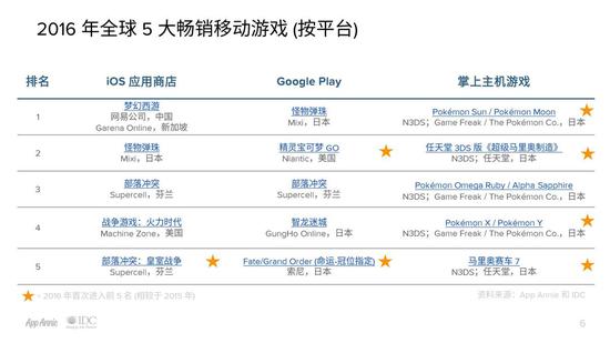 报告还公布了不同平台2016年全球5大畅销移动游戏。iOS平台上,中国的《梦幻西游》排名第1;Google Play则是《怪物弹珠》排在首位;掌上主机平台,《精灵宝可梦 日月》最为畅销。