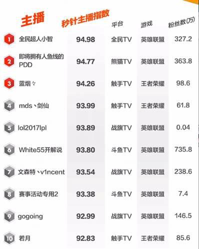 近日,第三方数据监测机构秒针发布了最新一期直播网红热度榜游戏主播TOP10。榜单显示,《英雄联盟》和《王者荣耀》已经两分Top10天下,《Dota 2》、CF等其他热门直播游戏并未上榜。其中触手直播表现抢眼,3名《王者荣耀》上榜主播蓝烟、mds丶剑仙、若月均来自触手,手游直播第一平台实至名归。