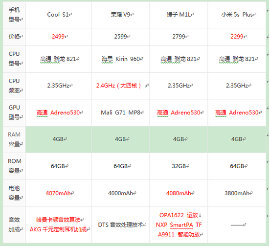 从战斗力对比中可以看出,在价格方面小米5s Plus和Cool S1的价格相对较低。