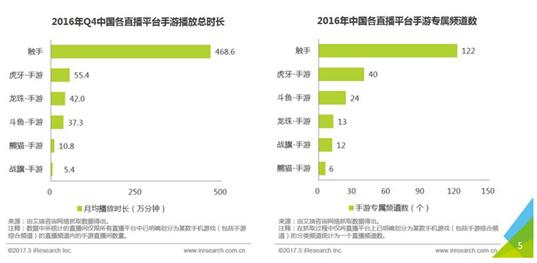 对比艾瑞MUT数据监测排名前十的手游数据以及触手平台相对应的直播指数后可以发现,由于激烈、高操作难度的竞技类手游往往更受直播观众喜爱,导致竞技类手游用户在游戏直播平台的渗透率要明显高于单机和其他非竞技类手游用户。2016年Q4触手直播的移动竞技类手游播放总时长已经达到468.6万分钟遥遥领先,其中虎牙、龙珠分别以55.4万分钟和42.0万分钟分别居于第二位、第三位。