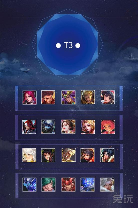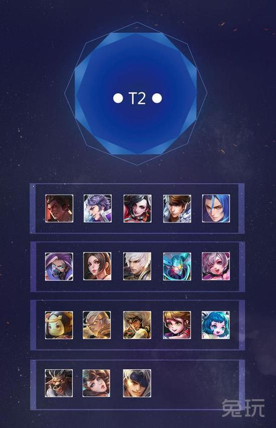 排名详解:T1是版本强势英雄,BP位常客。T2是版本常规英雄,可以进入常规阵容轮换且能发挥较稳定作用。T3是补位英雄,该梯队英雄功能性较强,虽实用性较之T1T2不够全面,但是在T1T2的某一个位置被BP针对的时候可以上场。T4是潜力英雄,因之前改动或现阶段环境受到发挥上的限制,经历版本改动或套路开发后很可能重新进入前列梯队。T5是弱势英雄,因大环境及同位置英雄的强势而导致无法登场。