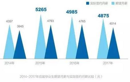 2017年,全国高校毕业生人数高达795万,较2016年增加了30万人。一边是全国高校毕业生人数连续多年屡创新高,本科生基数加大;另一边是经济增长速度放缓,吸纳新增劳动力空间有限,使得很多大学生不得不在求职时放低姿态。智联招聘《2017应届毕业生就业力调研报告》显示,2017年应届毕业生实际签约平均月薪为4014元,较去年大幅下降了751元,继2016年的下降后,再次降低。