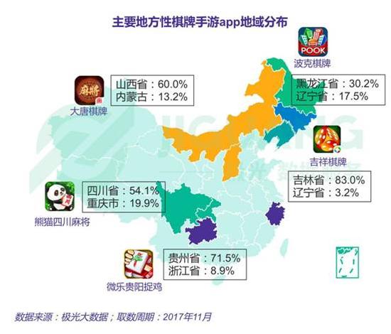 棋牌类游戏种类繁多,各地区的玩家到底都在玩什么游戏呢?从极光的报告中我们不难看出,《熊猫四川麻将》成为了四川用户的最爱,拿下54.1%市场份额。而《吉祥棋牌》赢得了吉林省玩家的心,占据83%的市场份额,《微乐贵阳捉鸡》则成功让贵州省玩家路转粉,占比达71.5%。