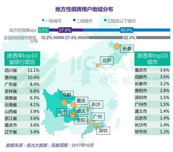 那么,到底是哪里的年轻人这么热衷地方性棋牌类手游呢?从极光大数据的报告来看,大多数用户分布在三线及以下城市,占据的份额高达66.9%。不同地区的用户对这类型游戏也有着明显的喜好之分,其中四川省、贵州省、广东省是棋牌游戏用户的聚集地,渗透率都超过8%。而从城市来看,重庆、成都、长春位列前三。