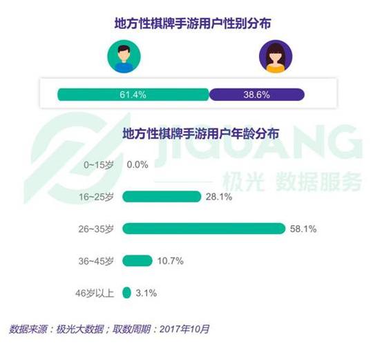 从报告来看,大爷大妈只占到了地方性棋牌类的3.1%,而主流用户反而是26-35岁的年轻人,占比达到58.1%,16-25岁的用户则占到28.1%,看来90后和80后的世界里,不止有《王者荣耀》、消消乐以及各种吃鸡游戏。而在性别分布上,男性用户占比61.4%,女性用户占比38.6%,这似乎印证了中国的各类牌局中男人多过女人的特点。