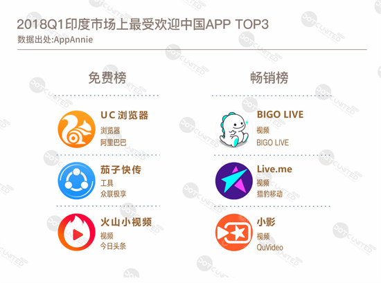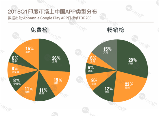 从产品品类来看,免费榜中,印度市场上的中国APP主要集中在工具、摄影和视频等品类,畅销榜则以约会、视频和效率类为主流。整体来说,2018年第一季度,印度市场上最成功的中国APP当属工具和视频类APP。