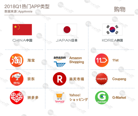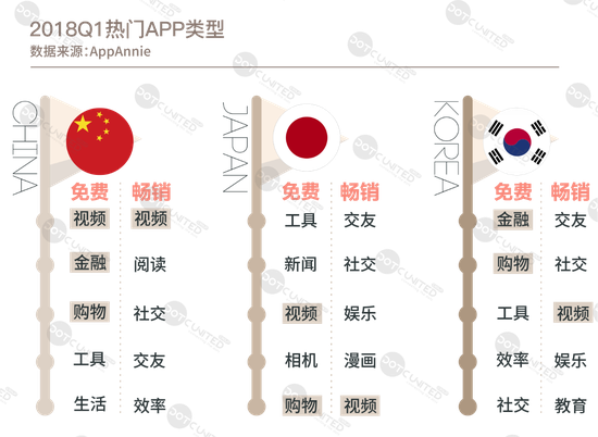 纵观中日韩2018第一季度免费、畅销榜单,三个国家主流APP类型有共性有个性,总体来说,包括长视频、短视频和直播的视频类APP,以及购物类、金融类APP在亚洲地区大势所趋。