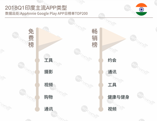 纵观印度2018年第一季度TOP 榜单,高居免费榜前三位的品类分别为工具、摄影和视频类,对于畅销榜单,由印度本土婚恋观念及社交局限等问题而催生的约会交友类APP首当其冲,其次通讯、工具等品类也备受瞩目。