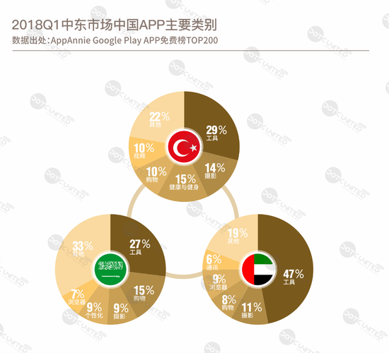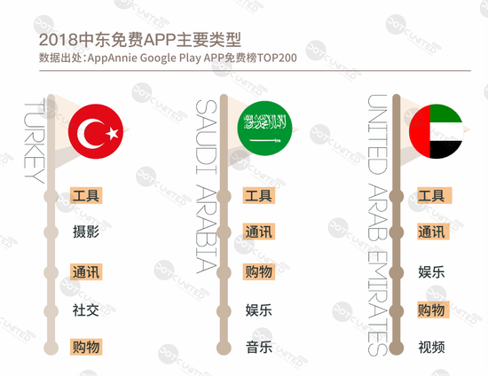 统计2018年第一季度土耳其、沙特阿拉伯、阿联酋免APP免费榜TOP200结果显示,整体来说,工具类、通讯类和购物类为主流类型, 从各国特点类型来看,土耳其用户偏摄影、沙特阿拉伯和阿联酋用户对娱乐类APP则同样颇为喜爱。