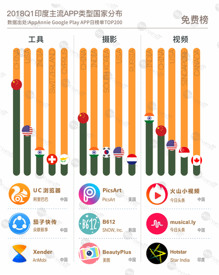 2018第一季度印度免费榜中,工具、摄影和视频三大主流类型APP主要来自中国、美国和印度本土。中国在工具和摄影APP上数量领衔市场,UC浏览器、文件传输工具茄子快传和Xender是印度用户最常使用的工具类APP,来自美国的PicsArt、韩国的B612和中国美图的BeautyPlus为当地最受欢迎的相机类APP。