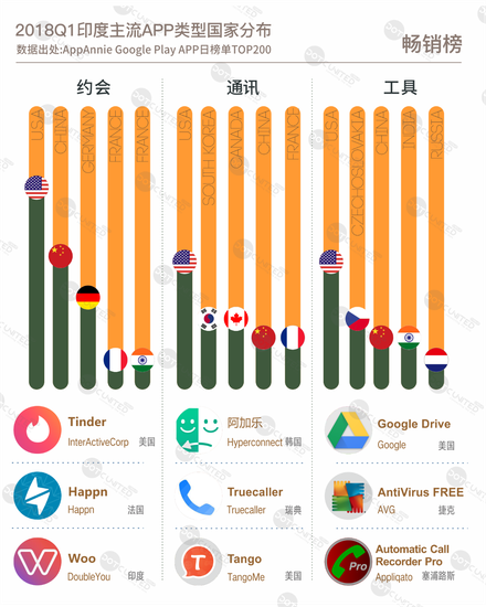2018第一季度APP畅销榜中,约会、通讯、工具三大主流APP都主要来自美国,此外,中国产品也占有重要席位,相比免费榜单,印度本土产品在畅销榜单上的表现差强人意,印度畅销APP市场基本可以说是外来产品的天下。