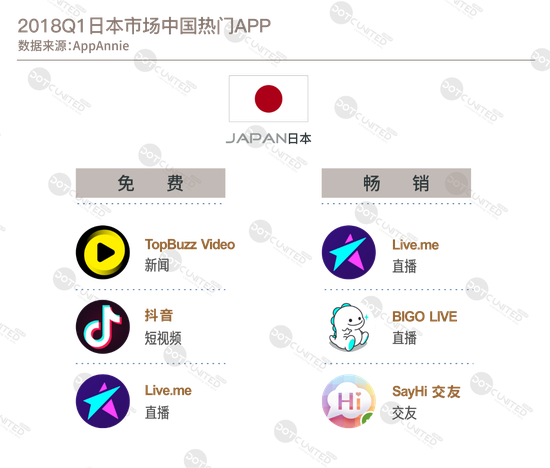 总体来说,2018年第一季度,中国在日本、韩国最受欢迎的产品都可用“视频”两个字概括:日本免费榜首位的Top Buzz Video是今日头条海外版Top Buzz的延伸产品,旨在给用户提供海量个性化视频和GIF;畅销榜首位直播产品Live.me,中国内容出海引领者之一,海外多个地区和国家榜上有名,最早出海美国频传捷报,杀回亚洲市场同样表现不俗,在日本免费榜同样居于前列。韩国免费榜首位的社交短视频抖音,国内短视频新秀,过去一年从国内杀到日韩,来势汹汹;BIGO LIVE,背靠国内直播巨头欢聚时代,东南亚视频社交霸主,在日韩市场同样表现不俗。