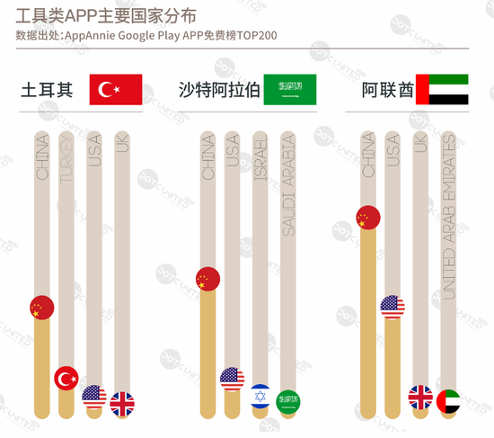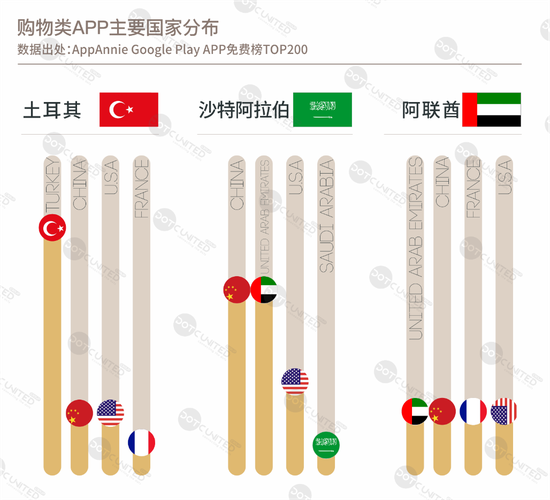 目前,土耳其市场上的购物APP有一半来自本土,其余则基本来自中国、美国;沙特阿拉伯和阿联酋的购物APP则是中国、阿联酋产品平分秋色。