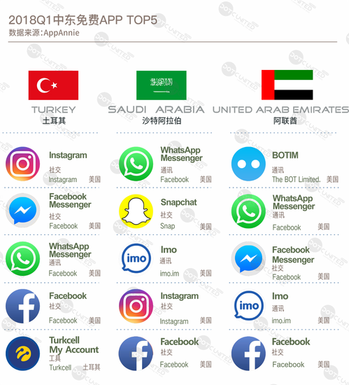 从上图可看出,土耳其、沙特阿拉伯和阿联酋的APP市场,除过邻国产品互有往来之外,最大的两个海外市场则是中国和美国。整体而言,美国在中东这三个国家的产品主要为社交、通讯、工具和摄影几大类,背靠Facebook、Instagram、Snap等互联网巨头,中东这三个国家的2018第一季度 APP榜单TOP5几乎清一色为美国产品,美国社交、通讯产品直戳中东用户痛点,在中东地区独霸一方。