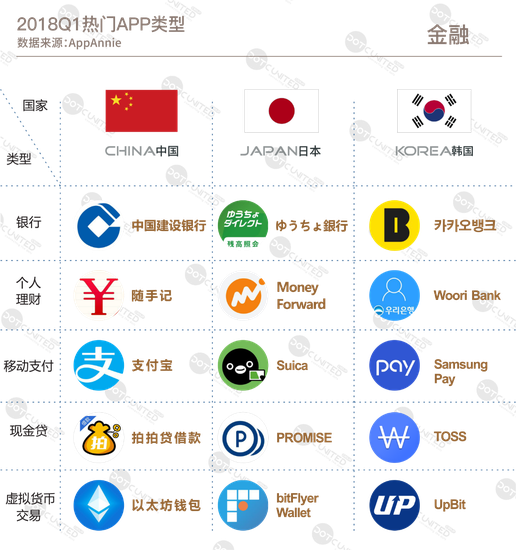 去年至今的汹涌的互联网金融浪潮中,中日韩三国APP榜单中,包括银行、个人理财、移动支付、现金贷以及虚拟货币交易等在内的金融类APP数量呈现爆发式增长,尤其是P2P信贷和虚拟货币交易APP。