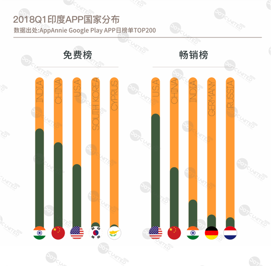 纵观2018第一季度APP免费榜、畅销榜TOP200国家分布,整体而言,中国、美国和印度本土占据市场主流。其中,免费榜唯本土产品马首是瞻,而畅销榜中,美国APP在数量上领衔市场。