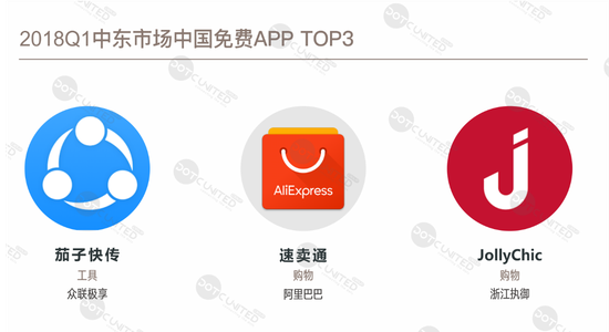购物类APP是2018年第一季度中国免费APP出海中东市场的第三大品类,上述也有提及,对于中东这个电商、移动电商潜力巨大的市场,目前中国成功的购物APP不胜枚举,但其中表现最好的当属速卖通和Jollychic,这两款产品同时也是2018年第一季度中东市场成绩仅次于茄子快传的中国出海APP产品。
