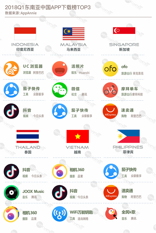 2018年第一季度,中国产品在东南亚各国的头部产品不尽相同,但总体来说,抖音、茄子快传、相机360和速卖通的综合表现最好。