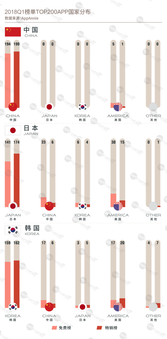 纵观2018第一季度,APP免费榜、畅销榜TOP200国家分布,整体而言,同游戏市场一样,中日韩三国APP都是属于本土垄断性质的,尤其是中国APP市场,TOP200中无一来自日本和韩国,美国也不过5款左右,除此之外,中国在日韩APP市场的渗透也是除本土外最多的,免费榜单TOP200中,中国APP占约十分之一,畅销榜单中也有数款入围。