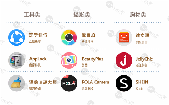 2018年第一季度,中国在土耳其、沙特阿拉伯、阿联酋三国的APP主要有工具、摄影和购物三大类,工具类中,茄子快传、AppLock应用锁和猎豹清理大师表现最为出色。