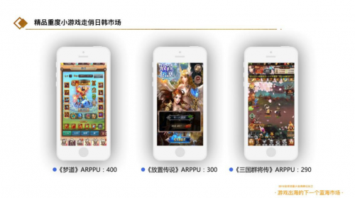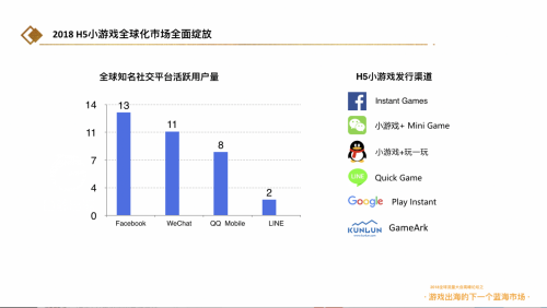 2018小游戏市场全球化全面绽放陈书艺讲到,现在国内的H5行业是少有的国内领先世界的细分类目,H5游戏以“快消”产品扮演手机页游的角色,满足移动端用户缺失的“快、爽”需求,同时通过社交,无缝衔接的特点创造了新需求,实现新蓝海的打造。随着用户认知度提高和消费升级完成,H5游戏活跃用户的比例和ARPU将继续增长。单纯从游戏布局来看,中小游戏开发商占据巨大的优势,并且国内的研发成本,推广策略和渠道格局都上升到一定高度,拥有成熟的手段,对于国内的研发团队来说,出海是具有非常大的优势的。