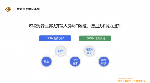 在演讲的最后,陈书艺简单分析了目前小游戏市场开发人才和市场需求严重不符的现象,白鹭教育的开办也是为了更好的培养H5小游戏人才,旨在为当下火热的小游戏市场解决开发人员缺口,促进技术能力提升。通过线上、线下、校企合作等方式探索与建立成熟的游戏人才培育体系,精准解决行业人才发展失衡和梯队建设。