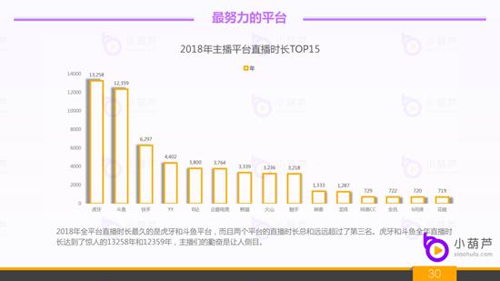 5、2018年直播行业最努力的平台:通过综合直播平台内主播们的直播时长总和进行排序。2018年全平台直播时长最久的是虎牙和斗鱼平台,而且两个平台的直播时长总和远远超过了第三名。虎牙和斗鱼全年直播时长达到了惊人的13258年和12359年,主播们的勤奋是让人侧目。